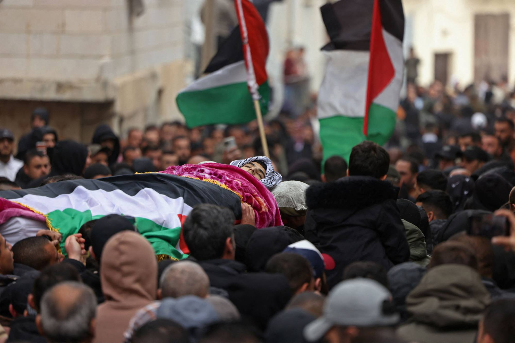 فلسطينيون يشيعون الأربعاء جثمان شاب قتله الأمن الإسرائيلي في قرية الظاهرة على مشارف مدينة الخليل بالضفة الغربية المحتلة (أ.ف.ب).