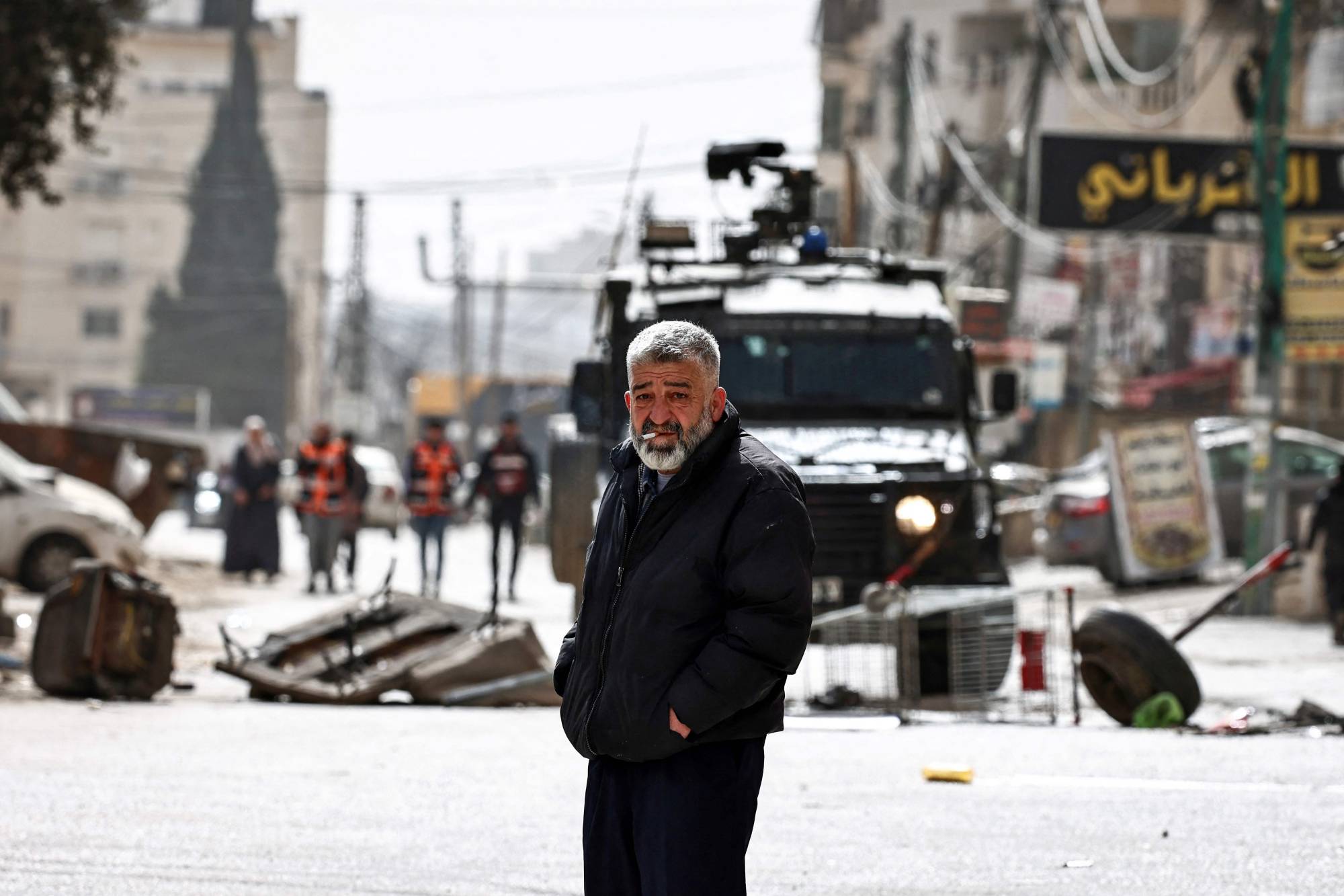 فلسطيني يقف الثلاثاء في أحد شوارع كفر عقب جنوب مدينة رام الله بالضفة الغربية المحتلة قرب قوات الأمن الإسرائيلية (أ.ف.ب)