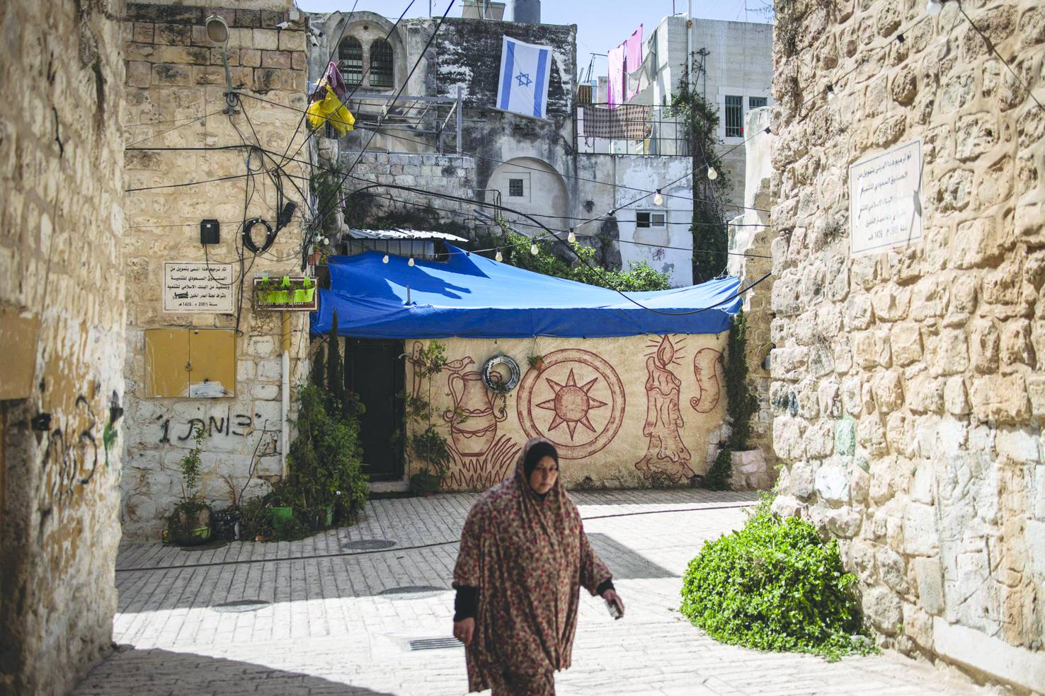 فلسطينية تمر قرب منزل رفع مستوطنون عليه العَلم الإسرائيلي وسط مدينة الخليل بالضفة الغربية أبريل الماضي (أ.ف.ب)