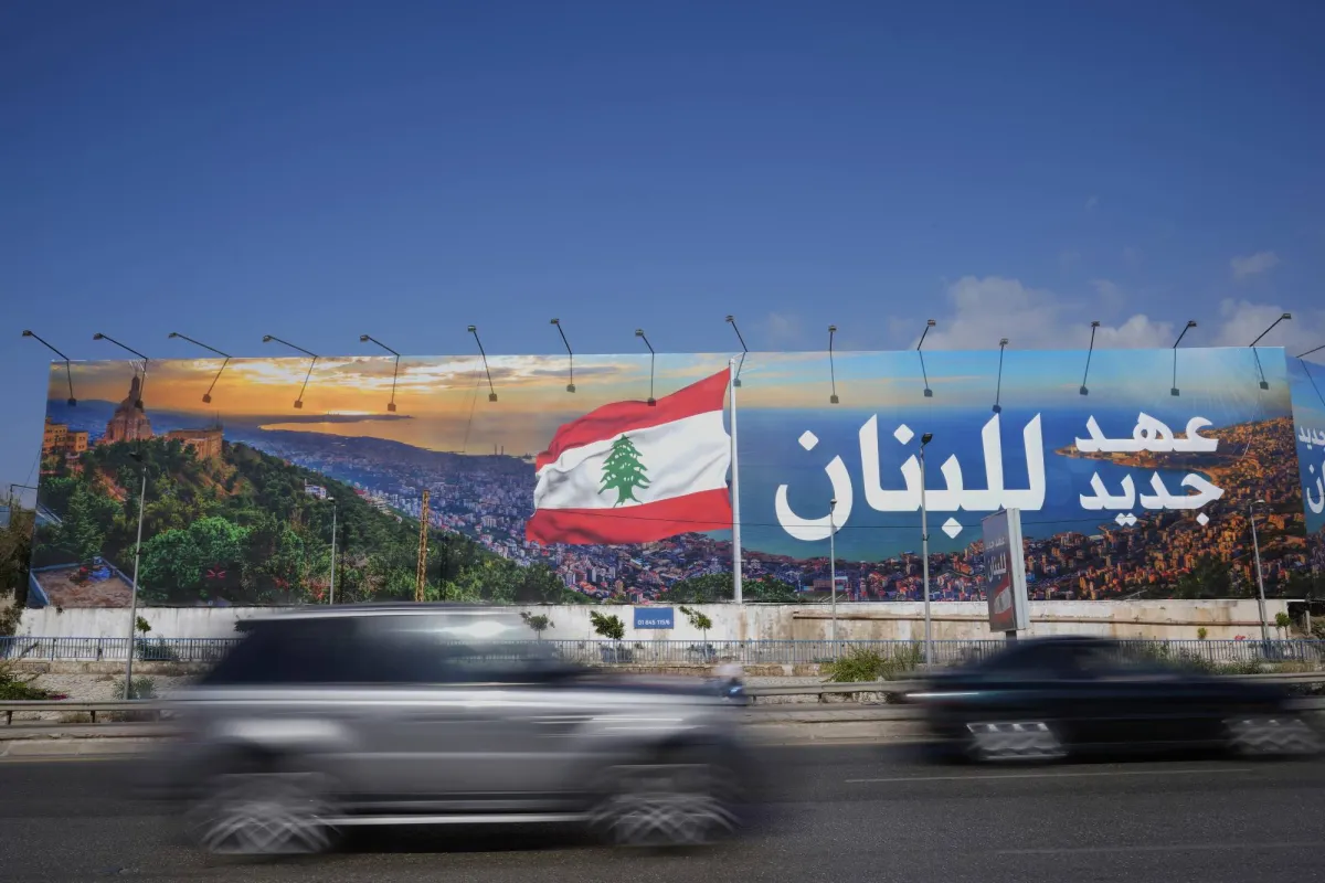لافتة على طريق «مطار بيروت الدولي» تروج للسياحة في لبنان (أ.ب)