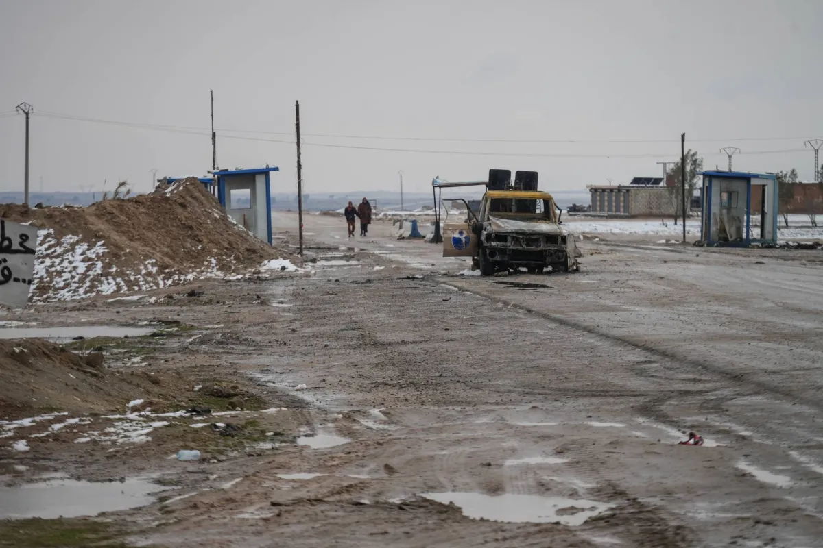 مركبات مدمرة على جانب الطريق بينما تنتشر عناصر من الجيش السوري بالقرب من خطوط المواجهة مع «قوات سوريا الديمقراطية (قسد)» على بُعد 9 كيلومترات من الحسكة شمال شرقي البلاد (إ.ب.أ)