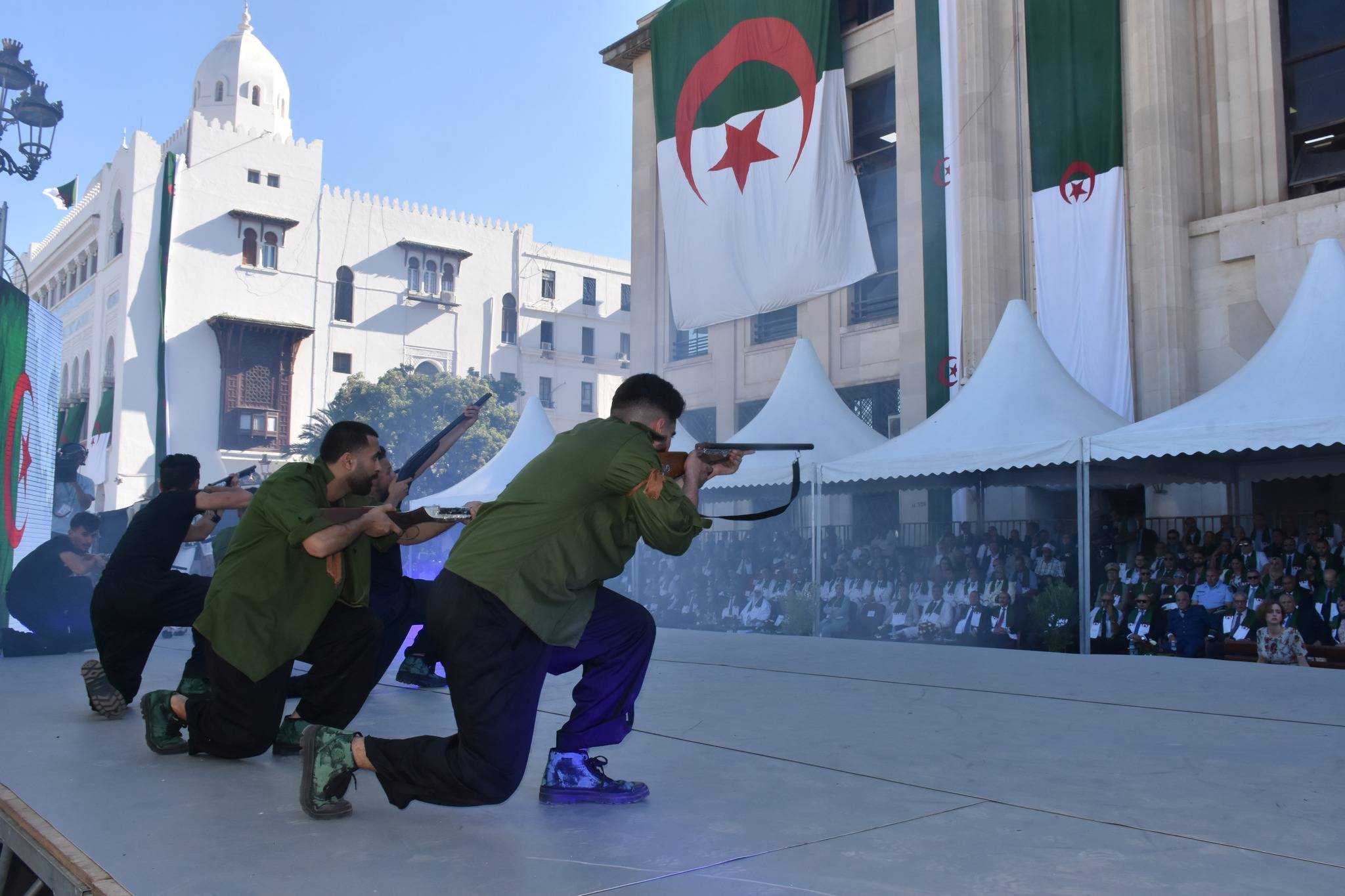 واستمرت الاحتفالات بالعاصمة حتى الساعات الأولى من صباح الأربعاء، وشهدت عروضا قدمتها فرق فنية وشباب «الكشافة الإسلامية الجزائرية»، بواسطة لوحات فنية تضمنت قصص المقاومات الشعبية ضد الاستعمار في بداية الغزو الفرنسي (1830 – 1962)، مثل «ثورة الشيخ المقراني»، و«ثورة لالة فاطمة نسومر»، و«ثورة الأمير عبد القادر الجزائري». وانطلقت العروض متتابعة، من «ساحة الشهداء» وصولا إلى البريد المركزي وعلى طول الواجهة البحرية، وتابعها أعضاء من الحكومة، منهم وزير المجاهدين العيد ربيقة ووزيرة الثقافة والفنون صورية مولوجي، ومستشارون برئاسة الجمهورية ووجوه بارزة من ثورة التحرير ضد الاستعمار (1954 – 1962) ممن بقوا أحياء.