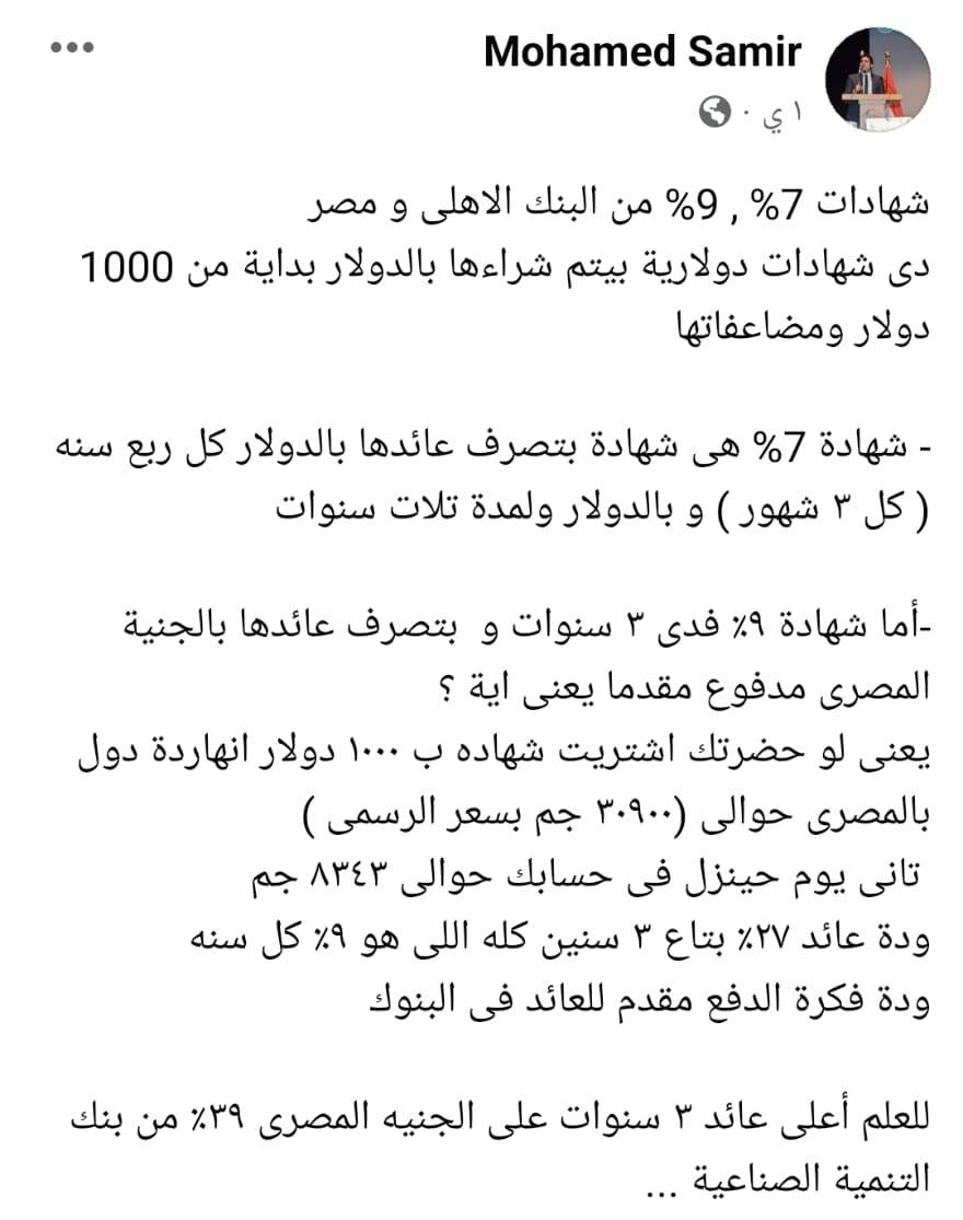 وأعلن بنك مصر والبنك الأهلي، بشكل منفصل، إصدار شهادتين دولاريتين بعائدات مرتفعة، وبدأ البنكان (الأربعاء) طرح الشهادات الجديدة على العملاء. تحمل الشهادة الأولى التي طرحها البنك الأهلي اسم «الأهلي بلس»، وتبلغ مدتها 3 سنوات، وتقدم عائداً سنوياً 7 في المائة يصرف بشكل ربع سنوي (كل 3 أشهر) بالعملة ذاتها، ويمكن الاقتراض بضمان الشهادة حتى 50 في المائة من قيمتها بالجنيه المصري، لأغراض استثمارية، وبحد أقصى يصل إلى 10 ملايين جنيه، بسعر عائد قدره 2.25 في المائة، وهو أقل من سعر إقراض البنك المركزي.
