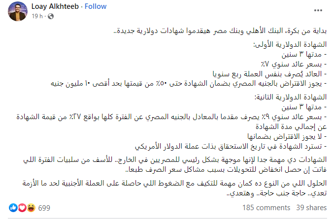 وأثار الإعلان عن طرح الشهادات الدولارية الجديدة جدلاً واسعاً بين رواد «السوشيال ميديا»، وتباينت الآراء والمشاركات، وركزت التعليقات على تصريح «عدم السؤال عن مصدر الأموال»، تداول كثيرون تدوينة تقول: «وداعاً لعصر من أين لك هذا؟».