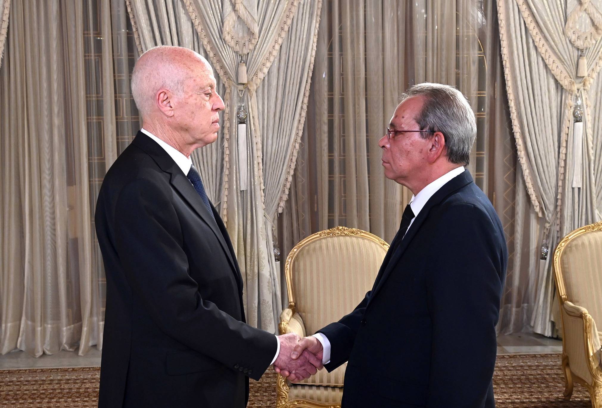 الرئيس التونسي قيس سعيد يصافح أحمد الحشاني في القصر الرئاسي بقرطاج بتونس بعد تعيينه (إ.ب.أ)
