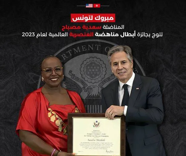 أثارت تهنئة قدمتها السفارة الأميركية في تونس لناشطة تونسية، بمناسبة فوزها بجائزة وزارة الخارجية الأميركية لأبطال مكافحة العنصرية الدولية لعام 2023، ردود فعل غاضبة في صفوف عدد من التونسيين؛ خصوصاً أنصار الرئيس قيس سعيد ومؤيدي مشروعه السياسي، وذلك بعد أن اعتبرت الإدارة الأميركية في البيان الذي أصدرته، أن الجائزة التي حصلت عليها التونسية سعدية مصباح، تعدُّ «تقديراً لشجاعتها الاستثنائية وقيادتها، والتزامها بالنهوض بحقوق الإنسان الخاصة بأفراد مجتمعات مهمشة عرقية وإثنية، وخصوصاً بالسكان الأصليين».