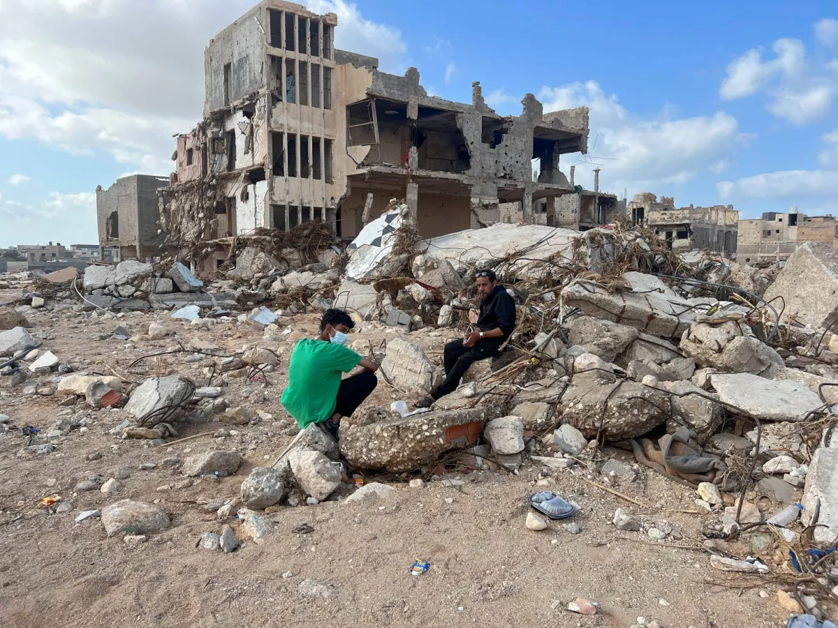 مواطنان يجلسان أمام بقايا منزل تهدم في مدينة درنة الليبية (رويترز)
