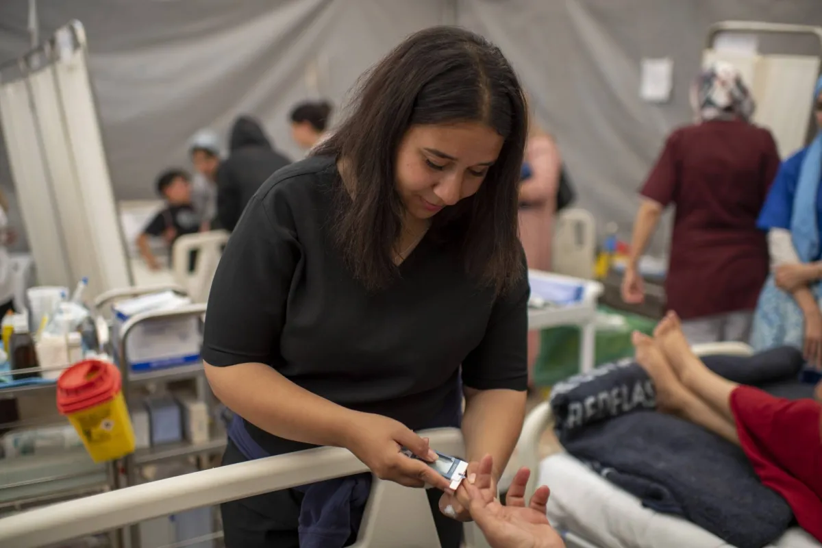 طبيبة تقدم الإسعافات لمصابة في منطقة أمزميز التي ضربها الزلزال (إ.ب.أ)