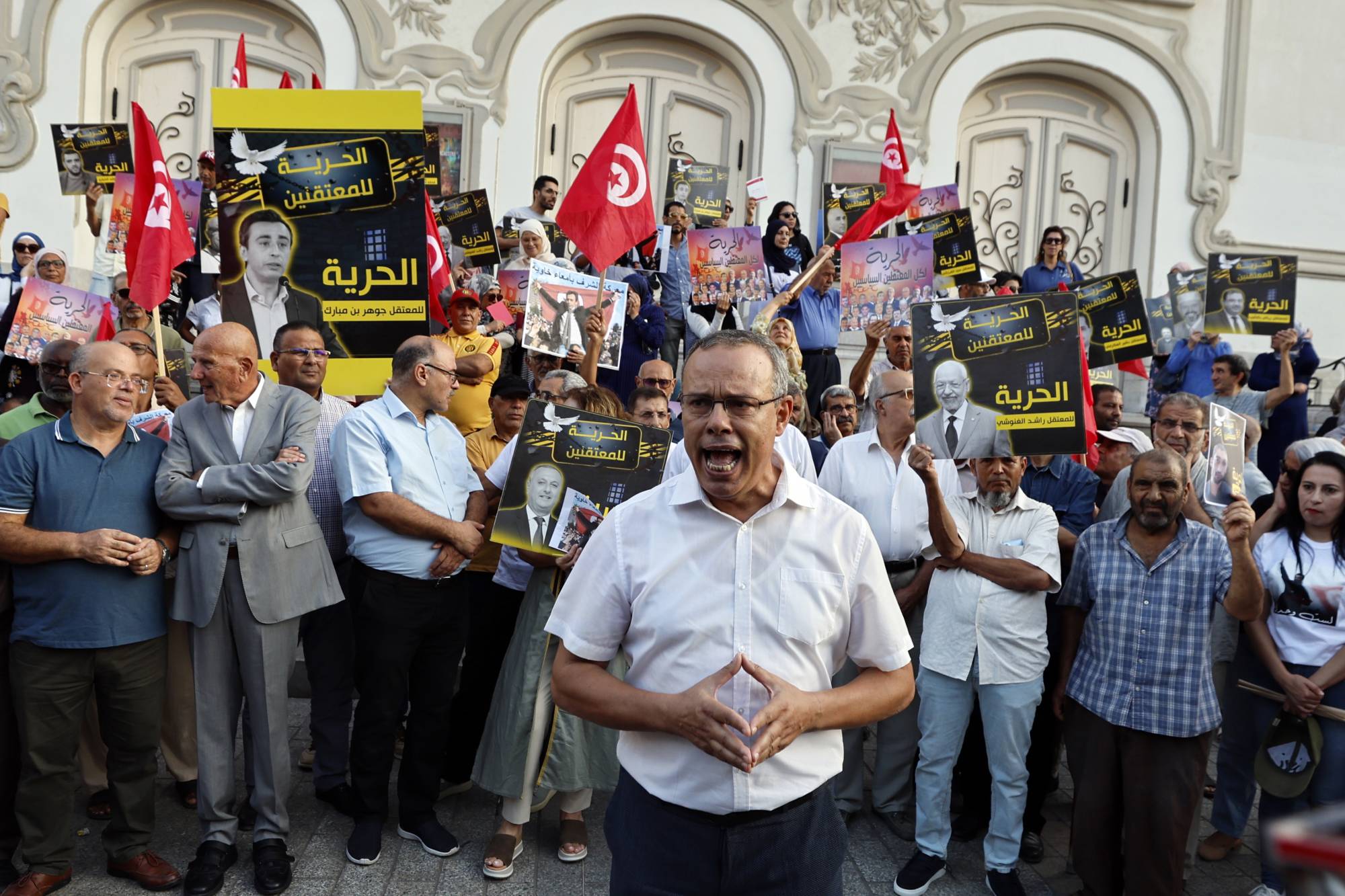 مؤيدون للحزب الدستوري الحر في تظاهرة وسط العاصمة للمطالبة بإطلاق سراح بعض قياداتها المعتقلين (إ.ب.أ)