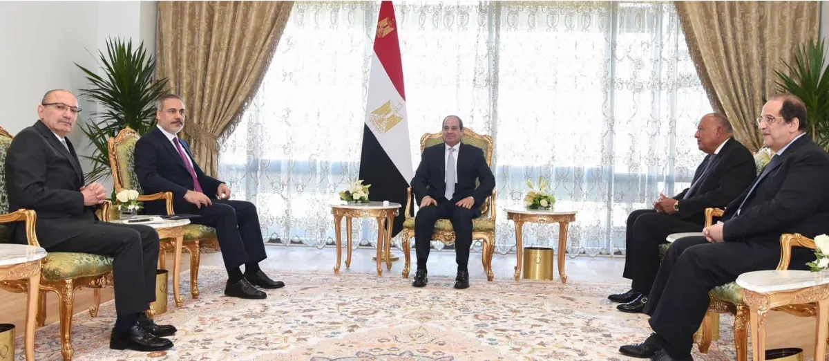 توافقت مصر وتركيا على «تكثيف الجهود الدولية للعمل على الوقف الفوري للعنف في غزة واستعادة التهدئة، واتخاذ إجراءات فورية وفعالة لحماية المدنيين ومنع تعريضهم لمخاطر القتل والتشريد والدمار». وبينما أعربت القاهرة وأنقرة عن «قلقهما نتيجة تردي الأوضاع الإنسانية في قطاع غزة»، أكد الرئيس المصري عبد الفتاح السيسي «أهمية إنهاء وطأة المعاناة الإنسانية المتفاقمة التي يتعرض لها أبناء الشعب الفلسطيني في غزة»، جاء ذلك خلال لقاء السيسي في القاهرة، وزير خارجية تركيا، هاكان فيدان، في حضور وزير الخارجية المصري، سامح شكري، ورئيس الاستخبارات العامة في مصر، عباس كامل.