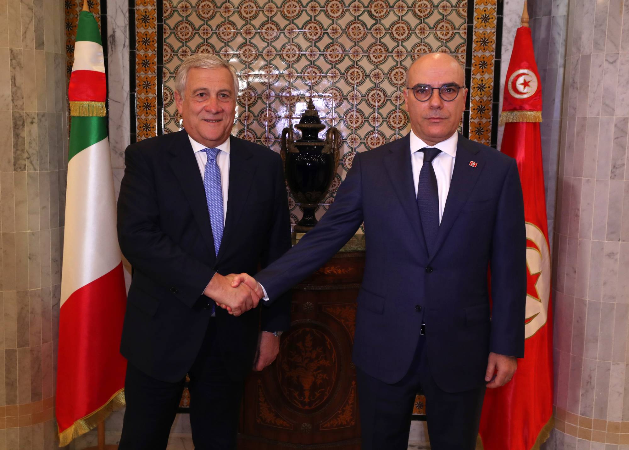 وزير خارجية تونس نبيل عمار مستقبلاً أنطونيو تاياني نائب رئيسة الوزراء الإيطالية ووزير الخارجية والتعاون الدولي (إ.ب.أ)