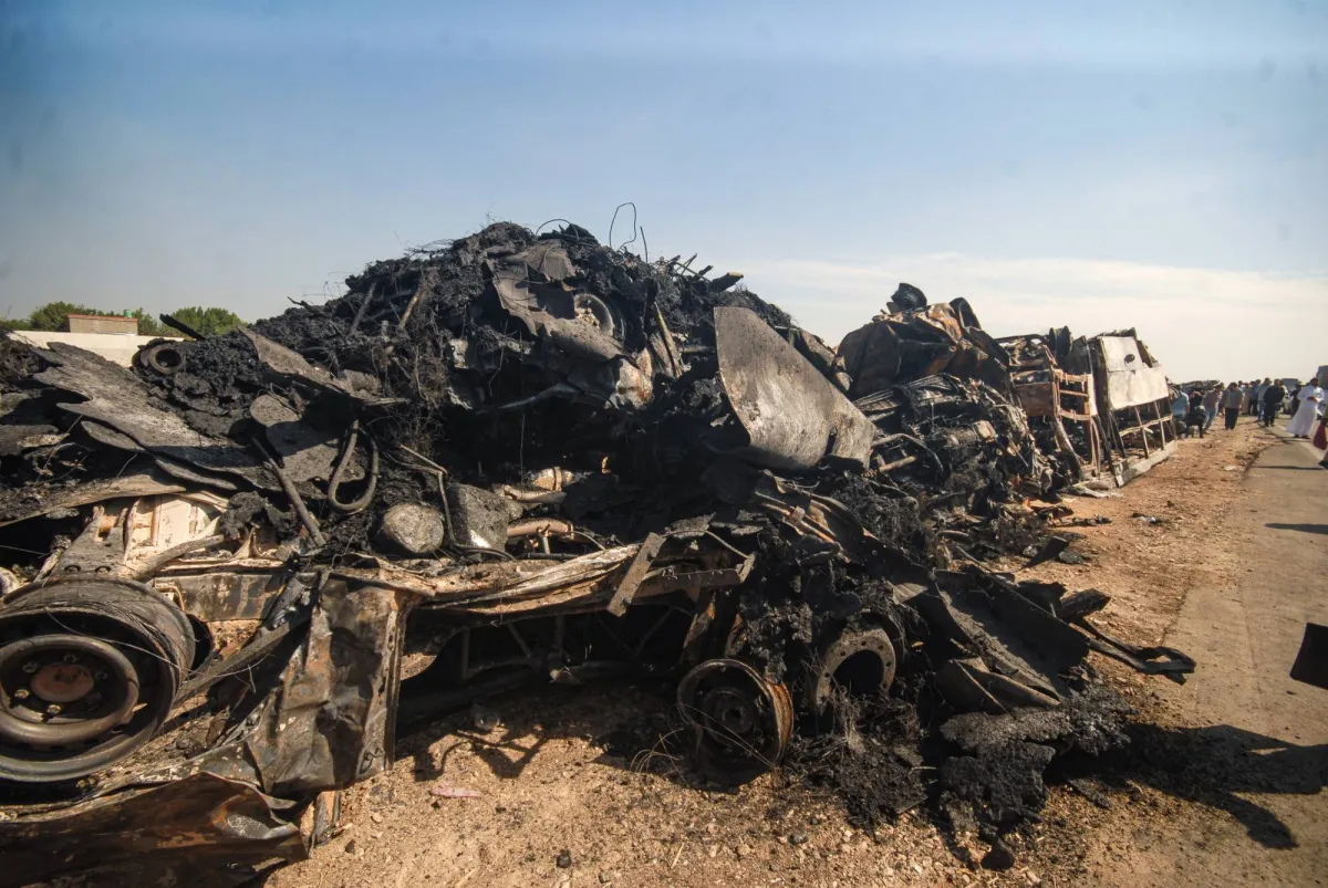 منظر للمركبات المحترقة إثر حادث مروري على طريق القاهرة - الإسكندرية الصحراوية (د.ب.أ)