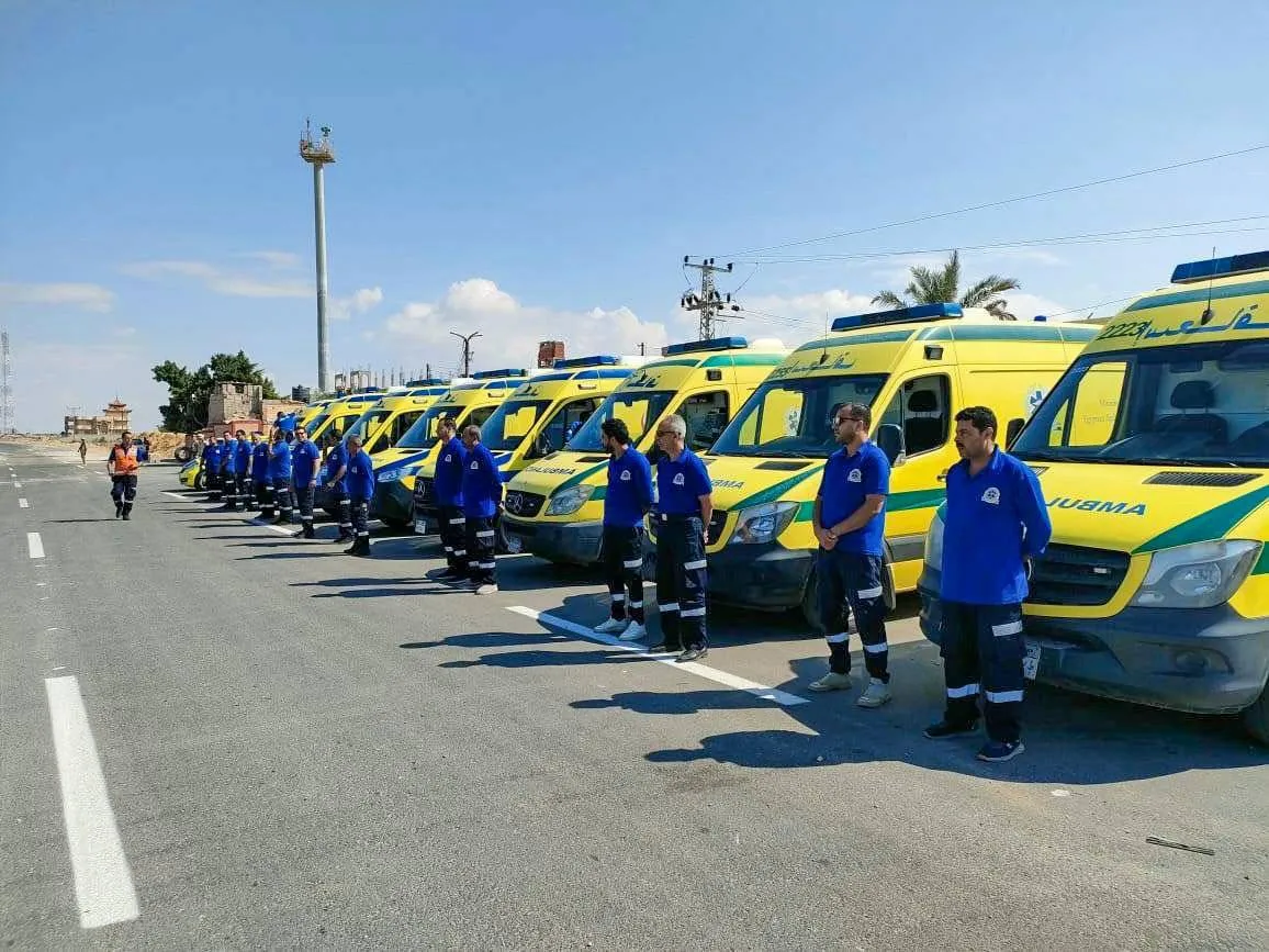 سيارات إسعاف مصرية تصطف على الجانب المصري لمعبر رفح (اتحاد قبائل سيناء على فيسبوك)