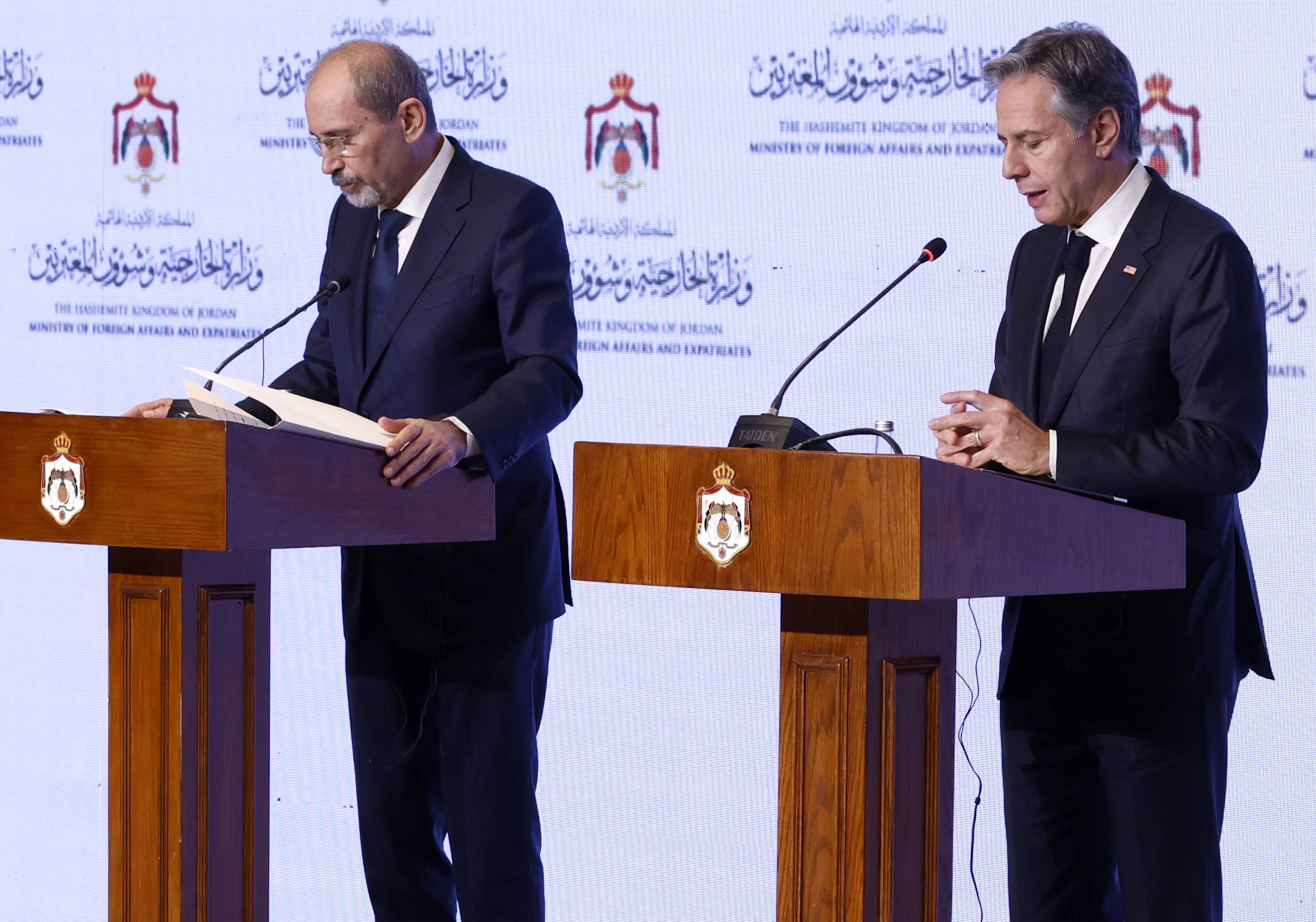 وزير الخارجية الأردني أيمن الصفدي ووزير الخارجية الأميركي أنتوني بلينكن خلال لقائهما في العاصمة الأردنية عمان (أ.ب)