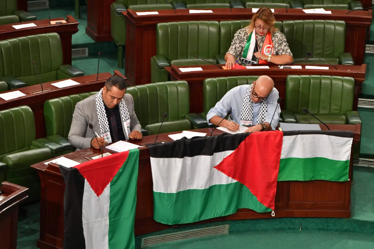 نواب في البرلمان التونسي يضعون الأعلام الفلسطينية تضامناً مع ضحايا غزة (أ.ف.ب)