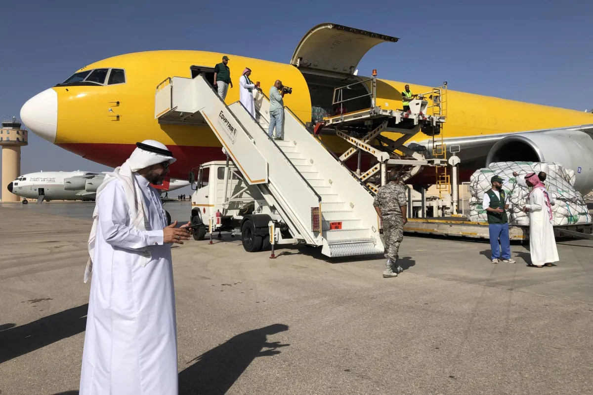 قوافل إغاثية من السعودية والإمارات والكويت تصل إلى مطار العريش
