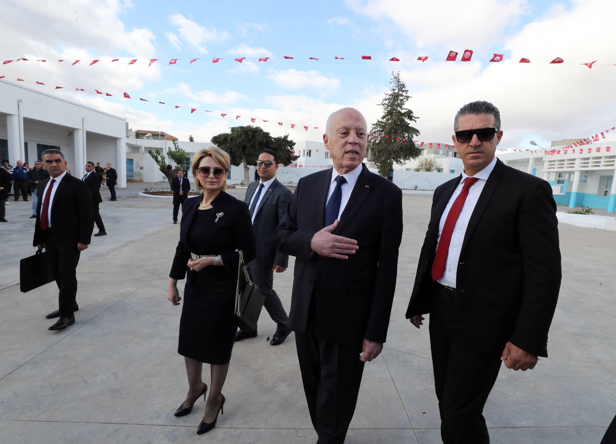 الرئيس التونسي بعد الإدلاء بصوته وإلى يمينه زوجته (إ.ب.أ)