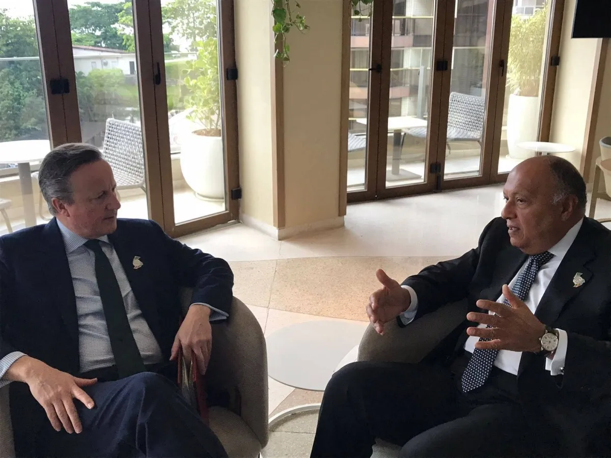 وقالت الوزارة، في بيان، إن شكري أكد، خلال اللقاء الذي عقد على هامش اجتماعات وزراء خارجية دول مجموعة العشرين في مدينة ريو دي جانيرو البرازيلية، على «تعويل مصر على الدور المأمول من المملكة المتحدة للضغط على الجانب الإسرائيلي للتوقف عن تحركاته لشن هجوم عسكري على مدينة رفح جنوب قطاع غزة، والانخراط بجدية في الجهود الإقليمية والدولية الهادفة إلى حل الأزمة الراهنة وتحقيق الوقف الفوري لإطلاق النار في قطاع غزة».
