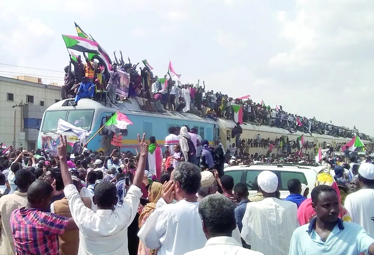 سودانيون من محافظات أخرى يصلون إلى الخرطوم بالقطار للانضمام إلى الاحتفالات الشعبية بعد سقوط نظام البشير (إ.ب.أ)