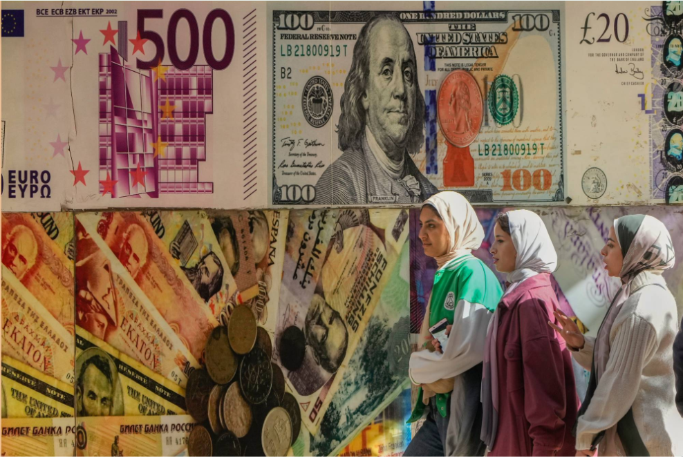 مصريات يسرن أمام ملصق يصور الدولار الأميركي وعملات أخرى خارج مكتب صرافة في القاهرة (أ.ب)