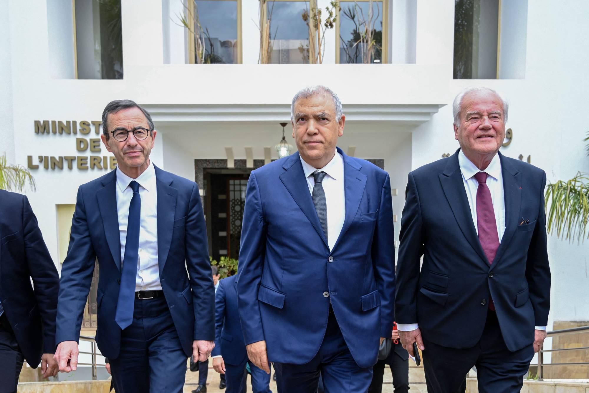 وزير الداخلية الفرنسي (أقصى اليسار) بمعية نظيره المغربي عبد الوافي لفتيت في الرباط خلال الزيارة الرسمية التي قام بها إلى المغرب (أ.ف.ب)