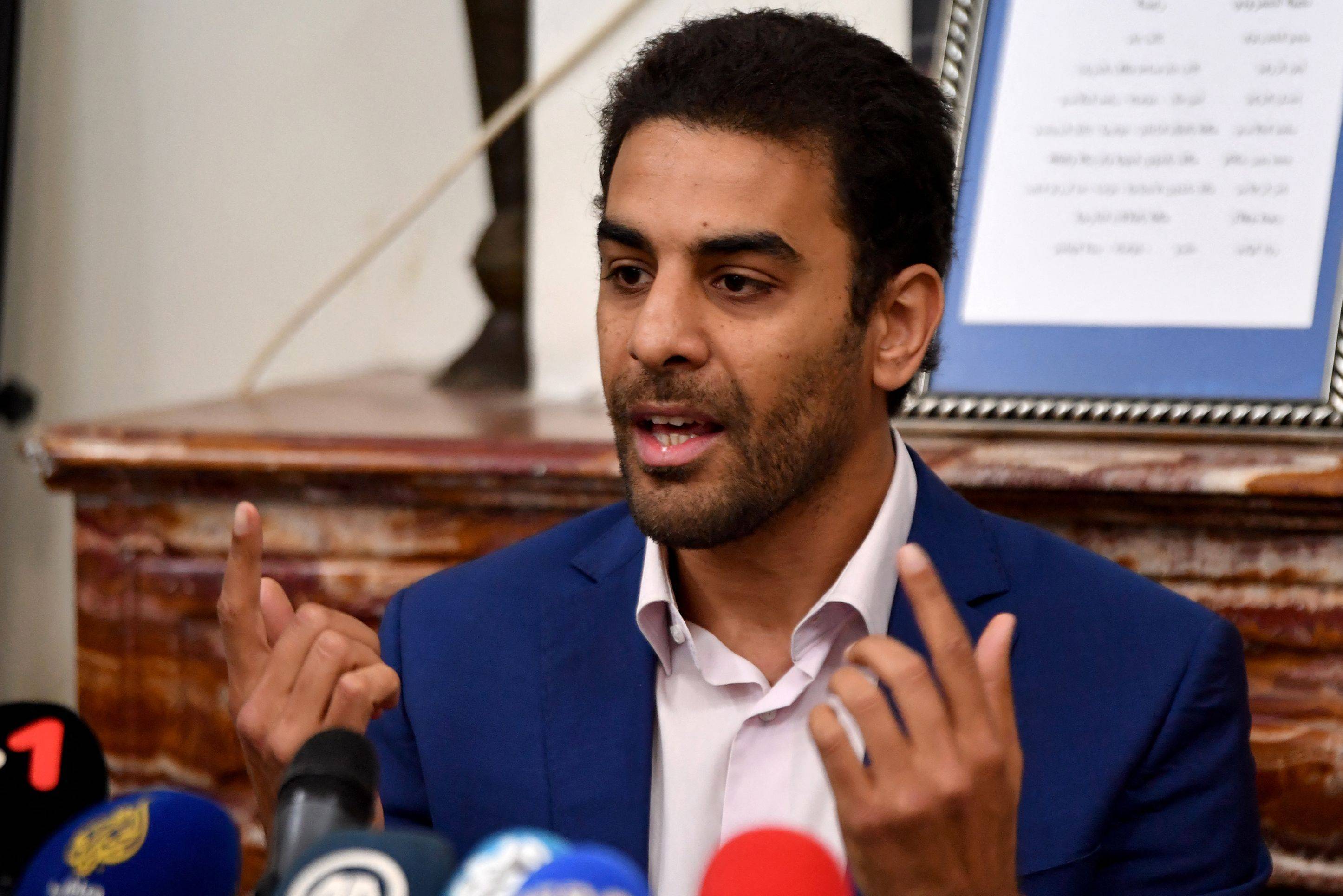 صائب صواب طالب في ندوة صحافية بإطلاق سراح والده لدواعٍ صحية (أ.ف.ب)