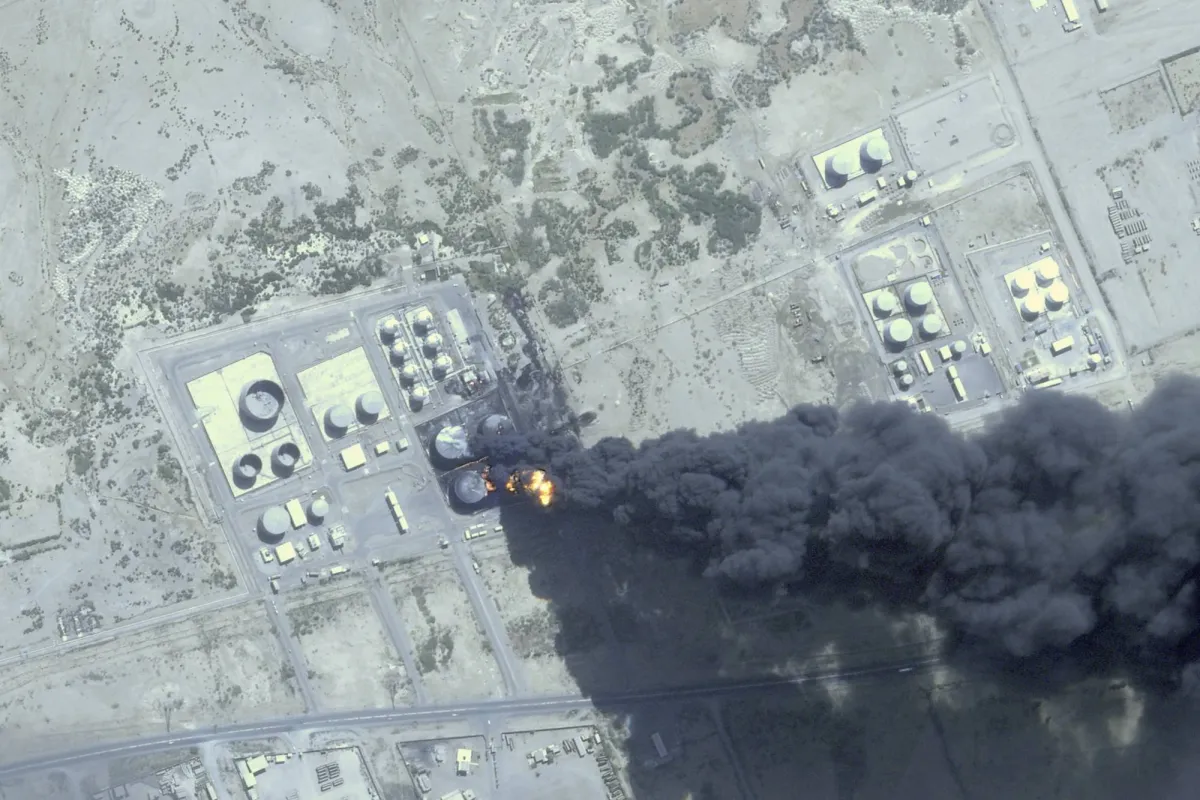 صورة فضائية تُظهر حريقاً في مستودع لخزانات الوقود بعد هجوم بطائرة مُسيَّرة شنته «قوات الدعم السريع» خارج بورتسودان أمس (أ.ب)
