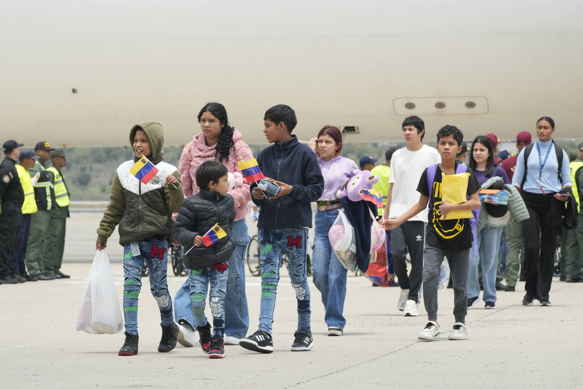 مهاجرون فنزويليون وصلوا من المكسيك ينزلون من الطائرة في مطار سيمون بوليفار الدولي في مايكيتيا بفنزويلا (أ.ب)