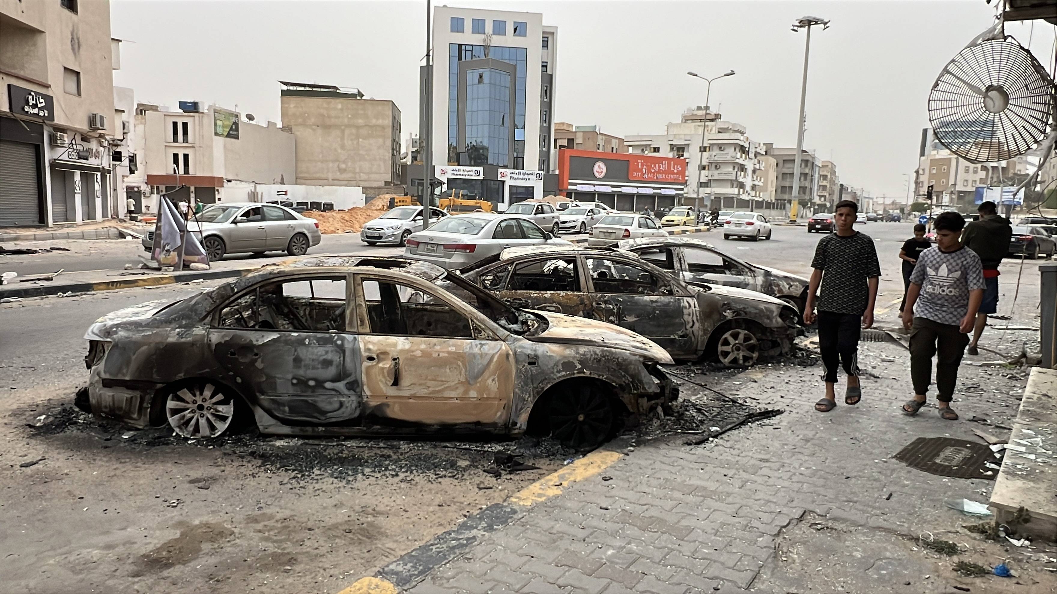 سيارات محترقة على جانب الطريق في طرابلس جراء اشتباكات مسلحة بالعاصمة الليبية (إ.ب.أ)