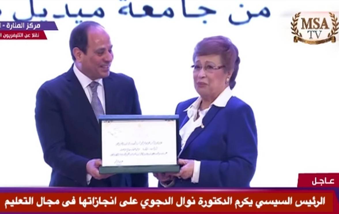الرئيسي المصري عبد الفتاح السيسي يكرِّمها لإنجازاتها في مجال التعليم (حساب جامعة «MSA» على «فيسبوك»)