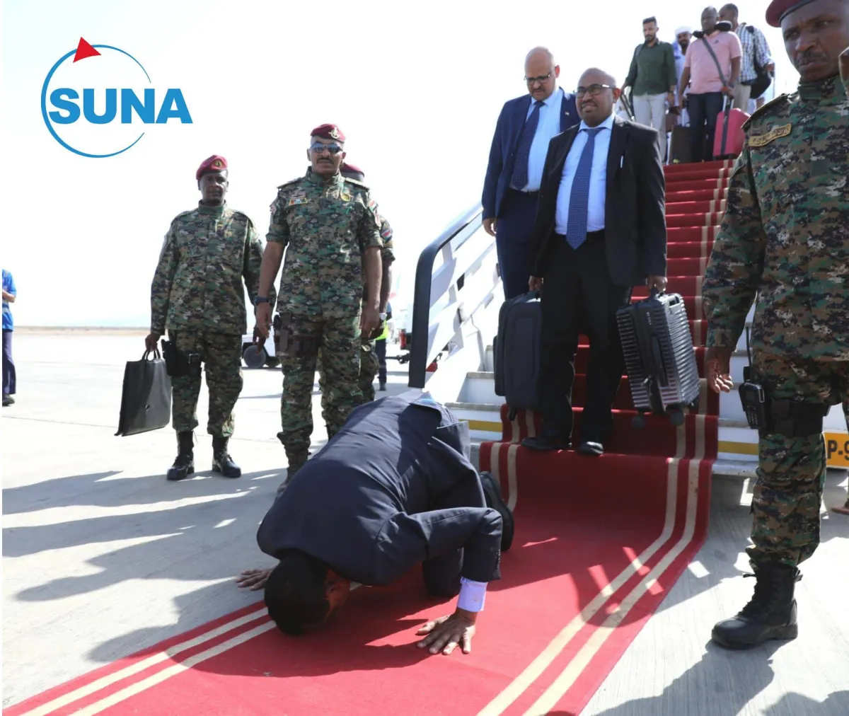 رئيس الوزراء يسجد لله عقب نزوله من الطائرة (سونا)