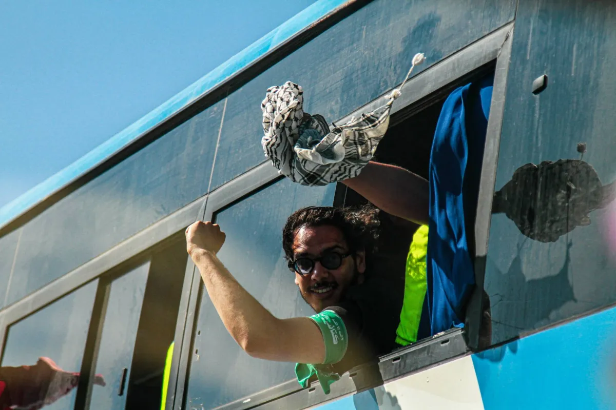 المشاركون في «قافلة الصمود» يلوّحون من حافلة (د.ب.أ)