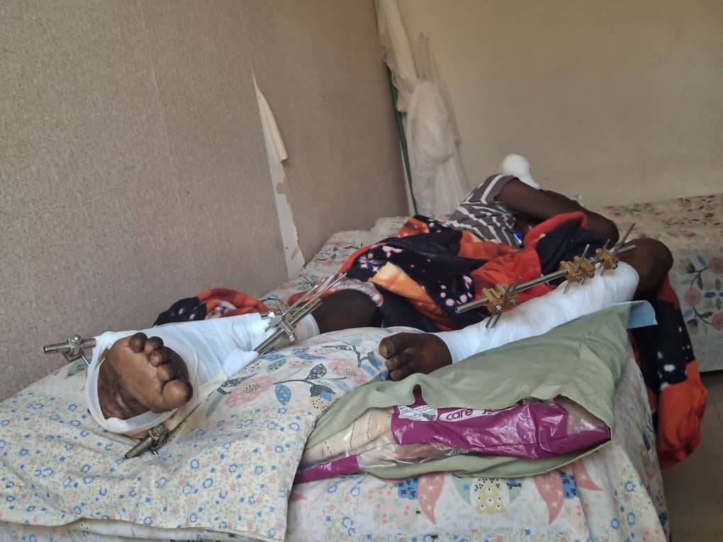 يقيم الطفل الجريح في منزل بمدينة أم درمان يفتقر إلى الكهرباء للاستقرار، والمرافق الصحية للدعم... ويغطي الشاش الأبيض قدميه المكسورتين، وعلى سطحه بقع دم متجددة، فيما وُضعت «مسطرة» على رجليه لتثبيت الكسور، فيرقد دون حراك.