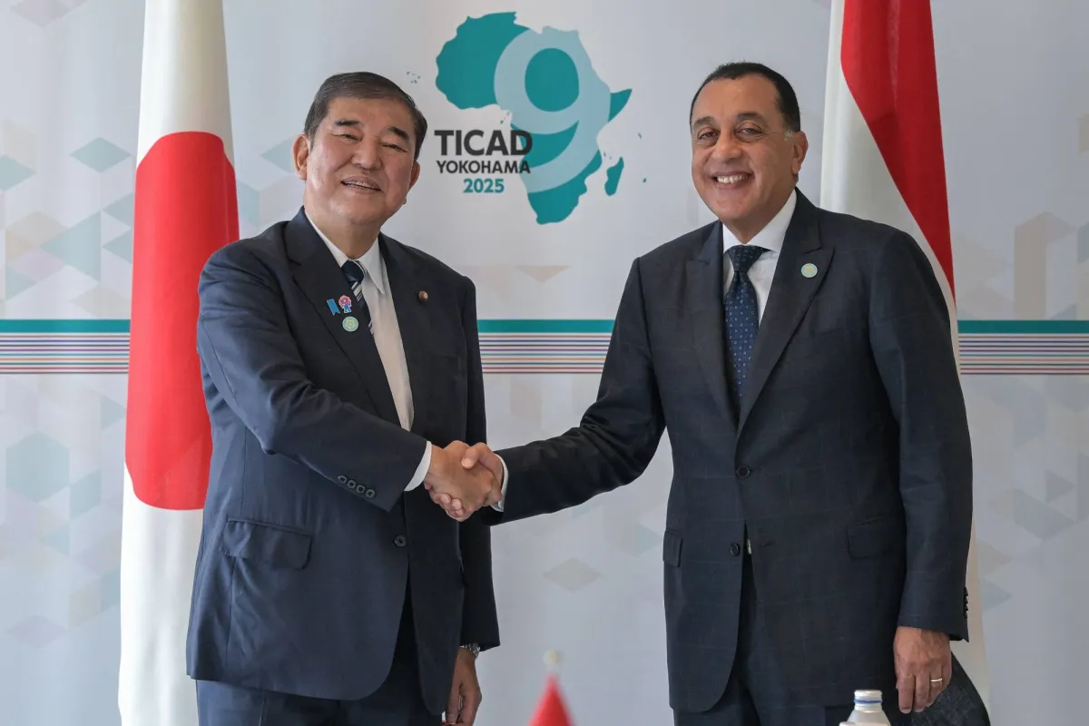 رئيس الوزراء المصري مصطفى مدبولي يصافح نظيره الياباني شيغيرو إيشيبا خلال اجتماعهما في مؤتمر طوكيو الدولي التاسع للتنمية في أفريقيا (تيكاد 9) يوم 22 أغسطس 2025 (أ.ف.ب)