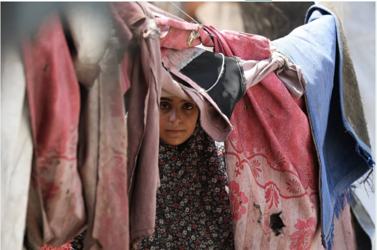 فلسطينية نازحة بسبب الهجوم الإسرائيلي تلجأ إلى أحد المخيمات (رويترز)