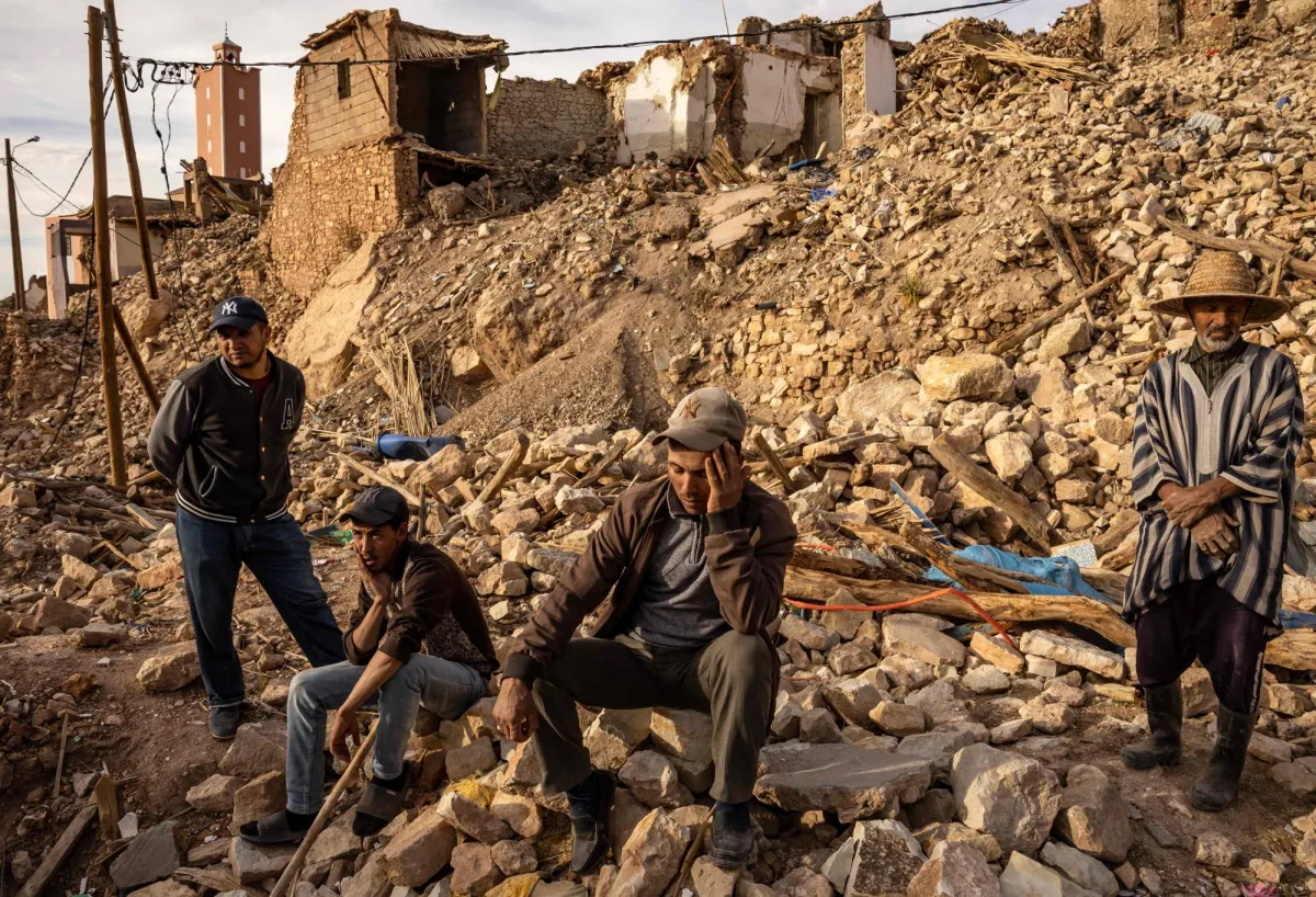 عدد من متضرري زلزال الحوز أمام بيوتهم المهدمة (أ.ف.ب)