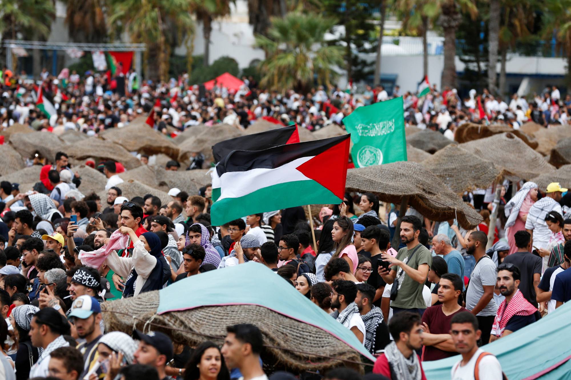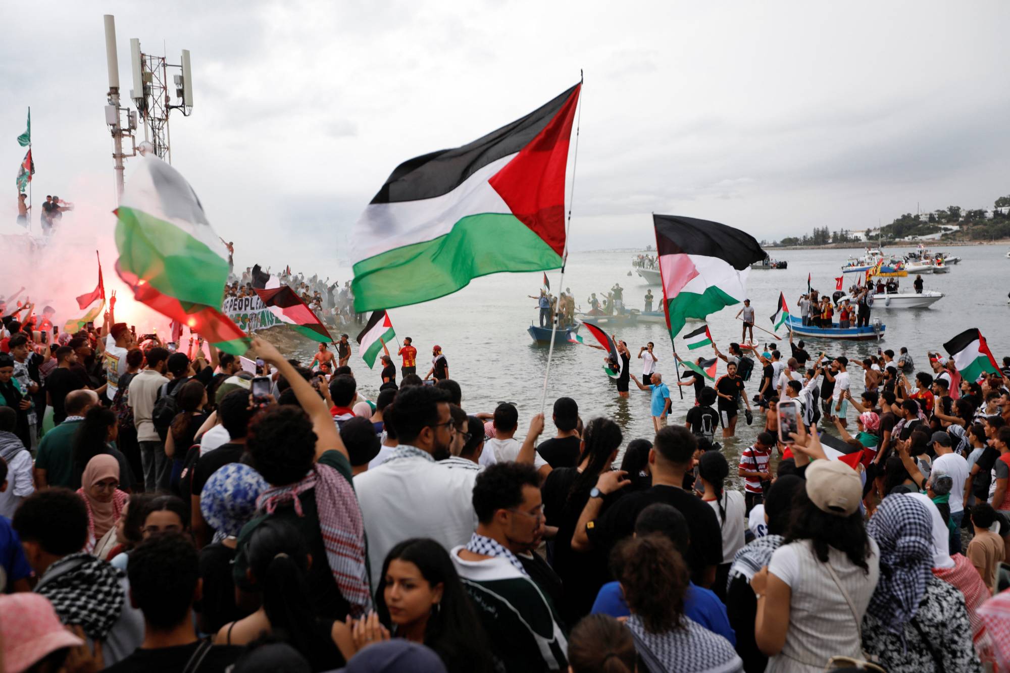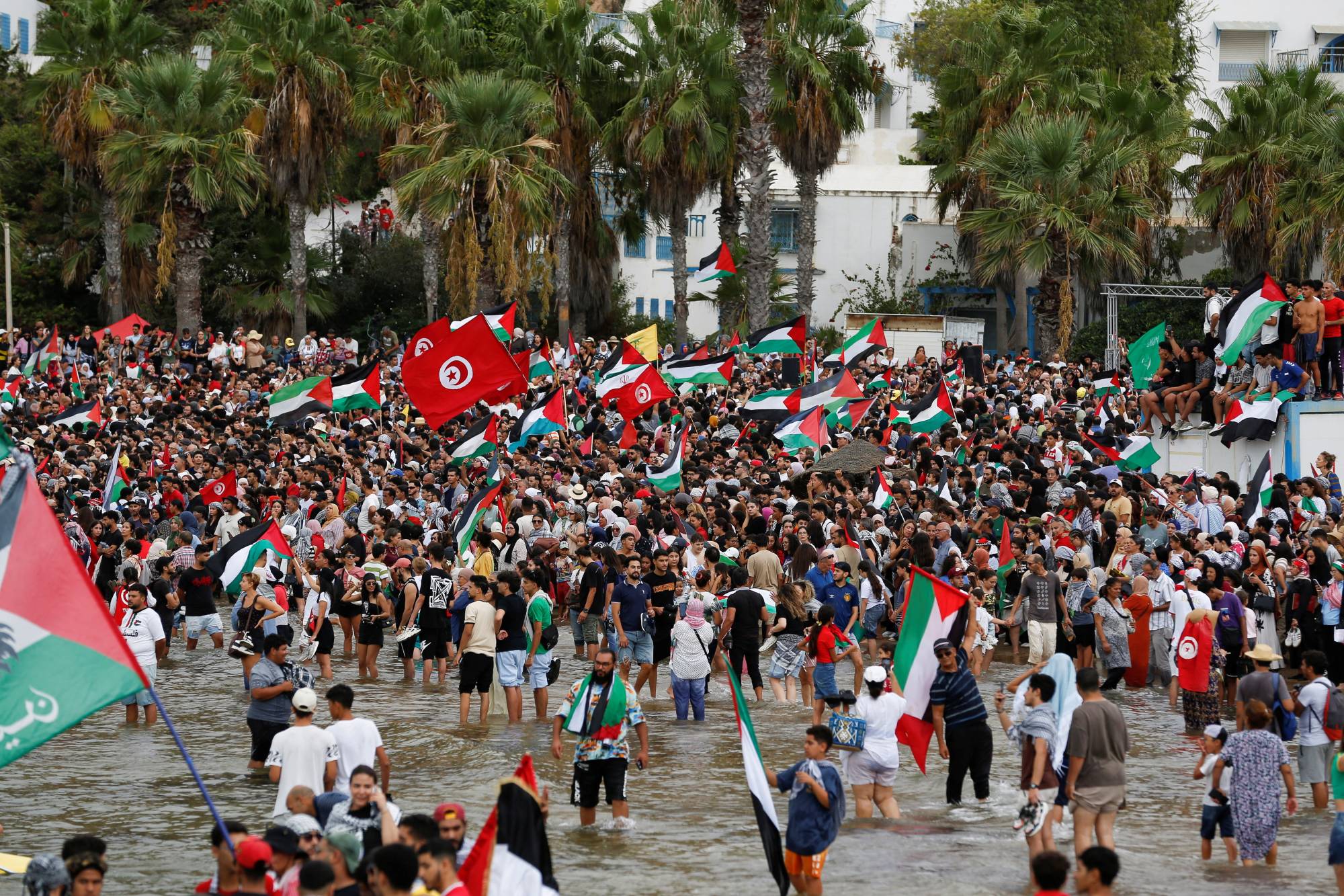 وتجمع الآلاف على شاطئ سيدي بوسعيد وهم يلوحون بالعلم الفلسطيني ويرددون هتافات تنادي بالحرية لغزة وتندد بإسرائيل والولايات المتحدة.