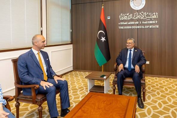 واستقبل رئيس المجلس الأعلى للدولة، محمد تكالة، مساء الخميس السفير الإيطالي لدى ليبيا، جيانلوكا ألبريني، في العاصمة طرابلس، وتناول اللقاء العلاقات الثنائية بين ليبيا وإيطاليا وسبل تعزيزها بما يخدم المصالح المشتركة للبلدين، و«بحث مستجدات الأوضاع السياسية في ليبيا، والجهود المبذولة لدعم المسار الديمقراطي وتحقيق الاستقرار»، فيما أشاد تكالة «بعمق العلاقات التاريخية بين ليبيا وإيطاليا»، مؤكداً «أهمية استمرار التعاون والتنسيق في مختلف المجالات».