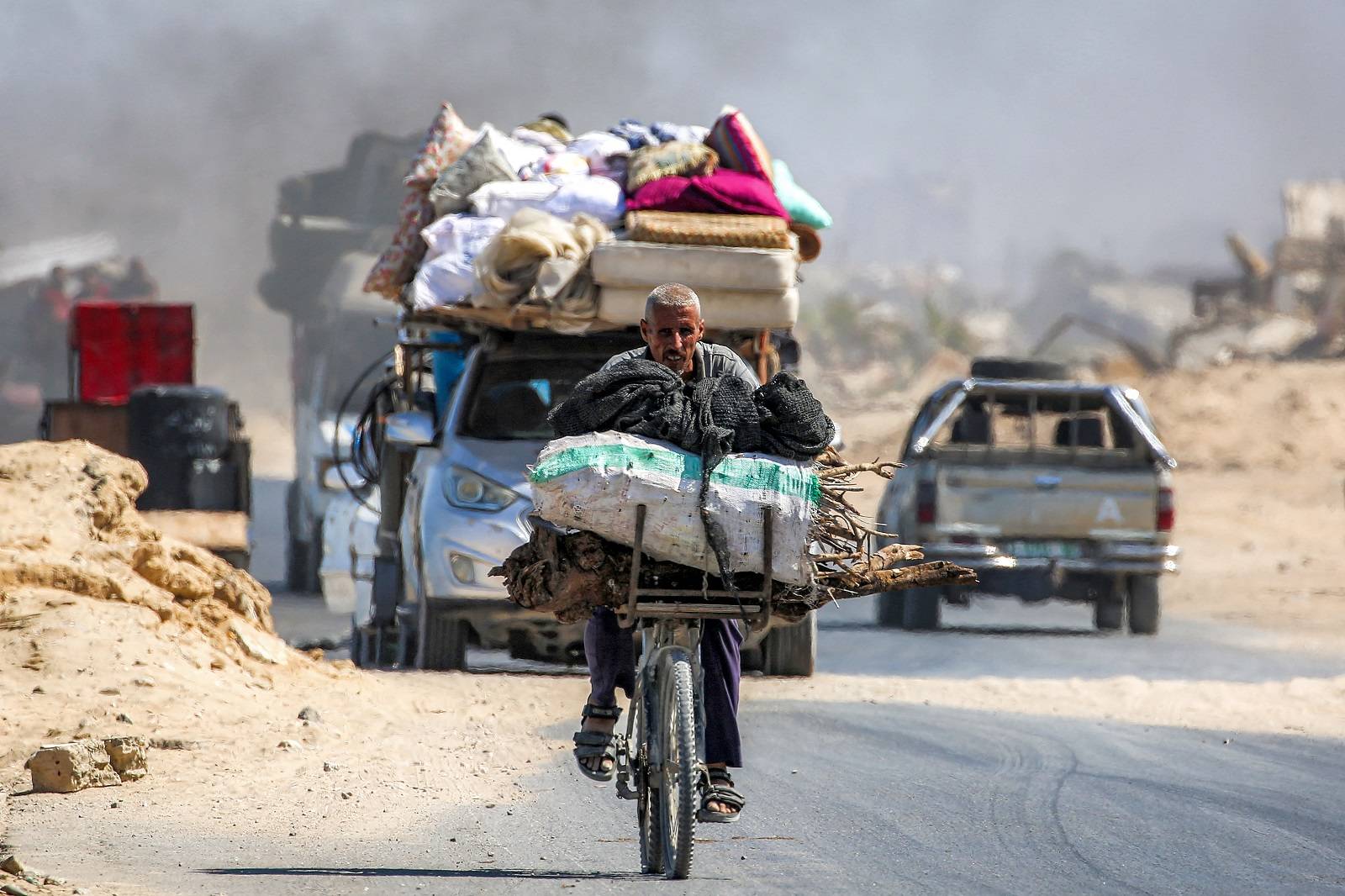 فلسطيني يركب دراجة هوائية حاملاً أخشاباً مُستصلحة على طول الطريق الساحلي الذي يسلكه النازحون جنوباً من مدينة غزة (أ.ف.ب)
