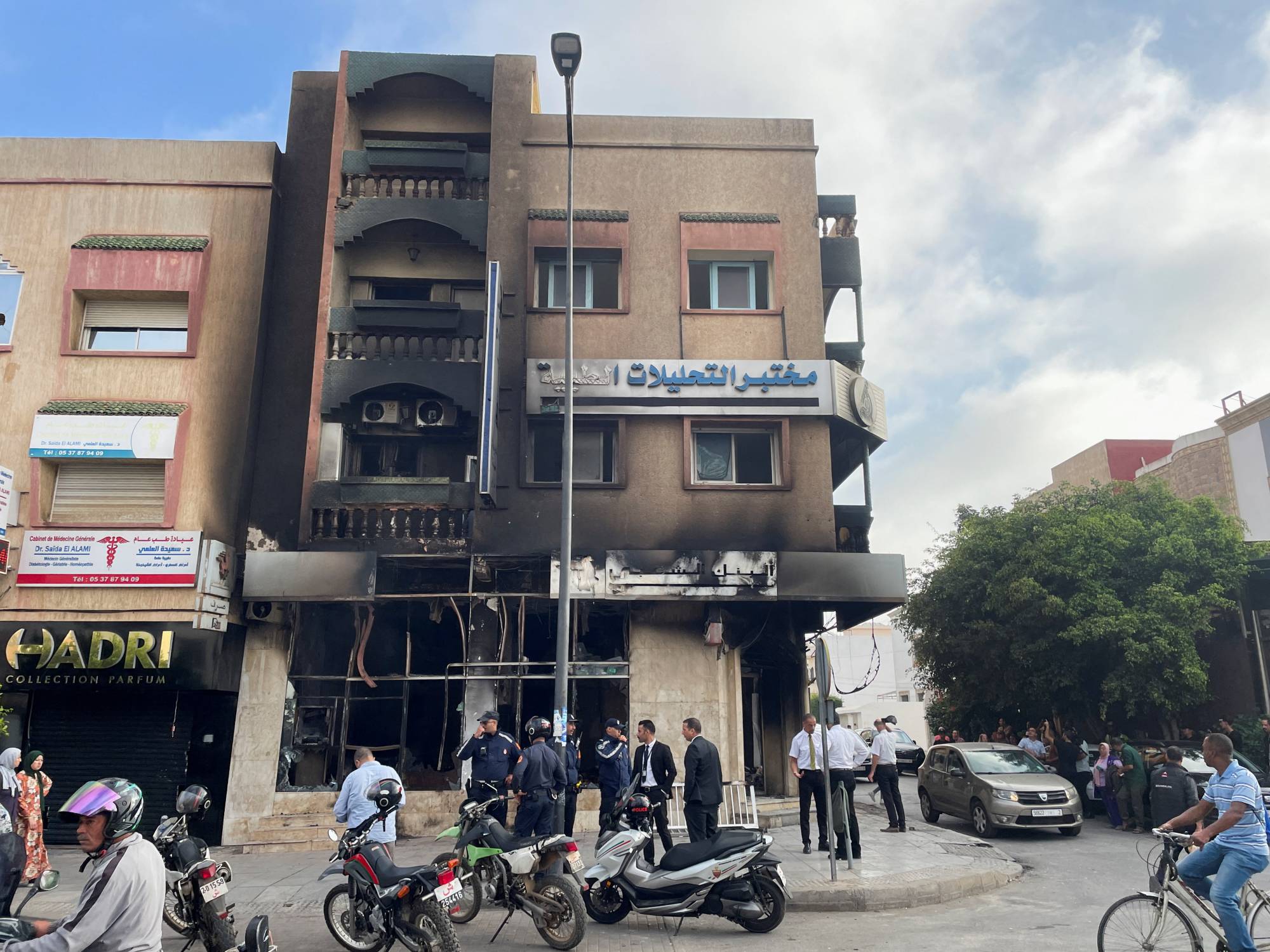 أشخاص بجوار مبنى محترق خلال الاحتجاجات في سلا بالمغرب (رويترز)