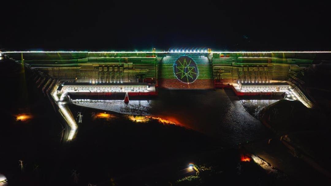 إضاءة سد النهضة بعلم إثيوبيا خلال افتتاحه في 9 سبتمبر 2025 (وكالة الأنباء الإثيوبية)