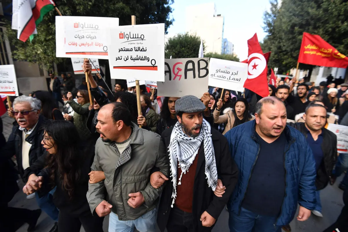 شارك متظاهرون في مسيرة تطالب بالحريات وسط العاصمة تونس، السبت، وهي الثانية خلال أسبوع، في وقت أصدرت فيه محكمة الاستئناف أحكاماً مشددة بالسجن ضد العشرات من الموقوفين، والملاحقين في قضية التآمر على أمن الدولة، حسب تقرير لوكالة الأنباء الألمانية. وشارك في المسيرة، التي انطلقت من ساحة باستور تحت شعار «لا تعليق للنضالات ولا لقمع الحريات»، سياسيون ونشطاء من الجمعيات والمجتمع المدني والحركات النسوية، وعدد كبير منهم من الشباب. وردد المتظاهرون شعارات غاضبة، أبرزها: «الشعب يريد إسقاط النظام»، و«حريات حريات... لا قضاء التعليمات».