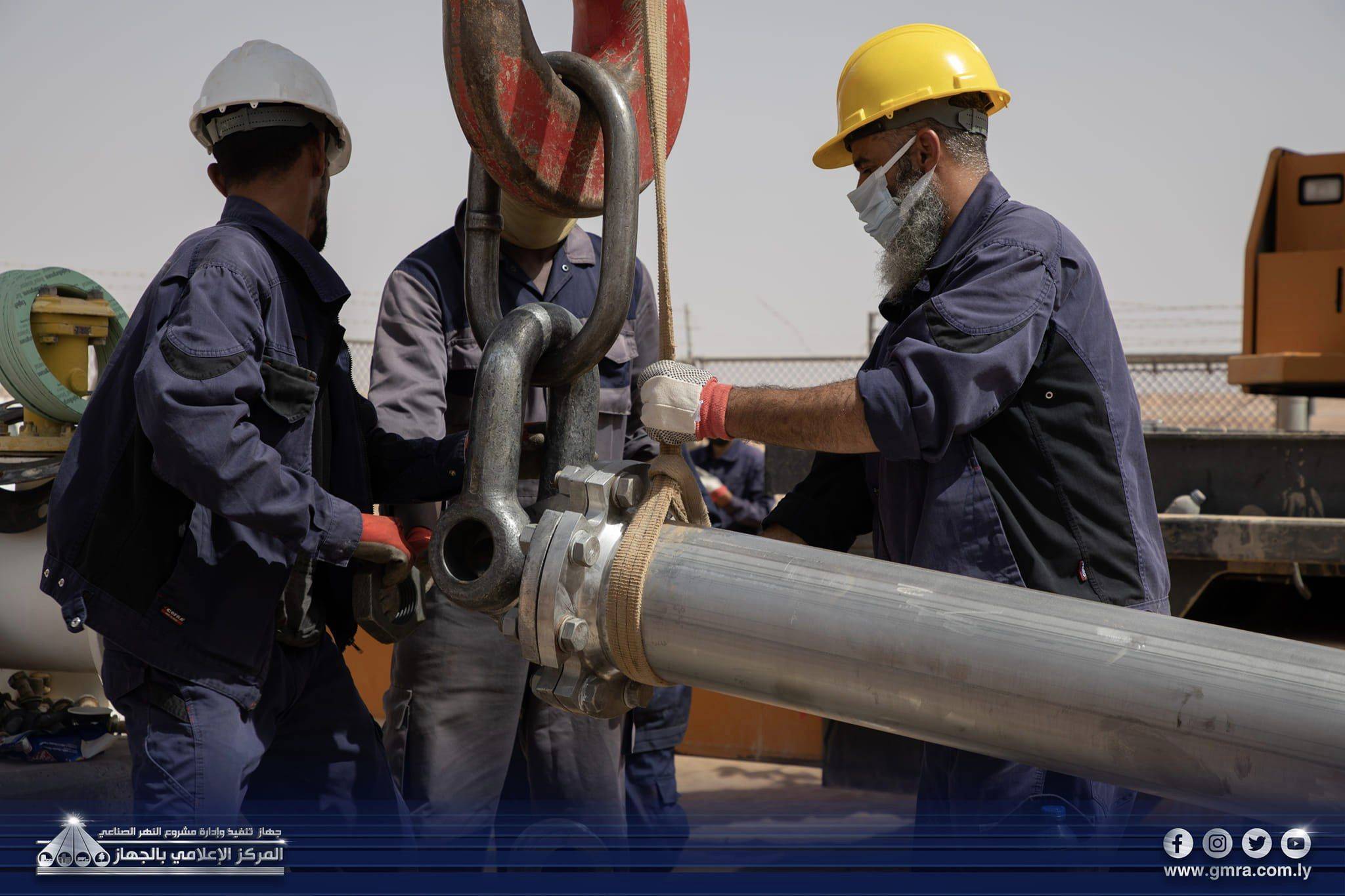 فنيون بجهاز «النهر الصناعي» في ليبيا يعملون على توصيل خط فرعي (النهر الصناعي)