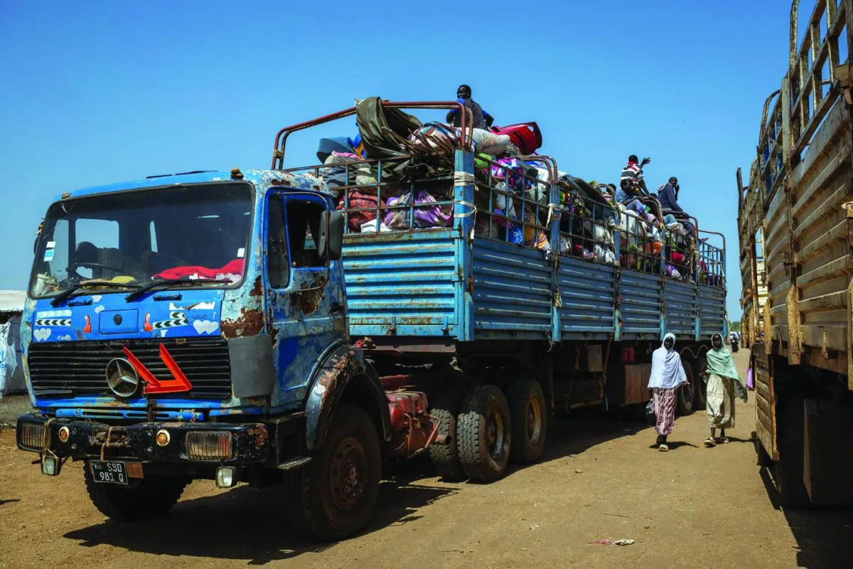 شاحنة محمّلة بممتلكات شخصية لعائلات نازحة تنتظر مغادرة نقطة حدودية في مقاطعة الرنك بجنوب السودان (أرشيفية - أ.ف.ب)