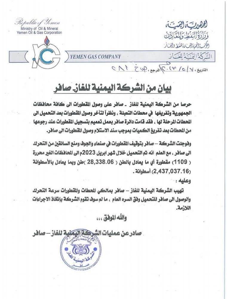 - شركة الغاز اليمنية خصصت لمناطق سيطرة الحوثيين خلال أبريل (نيسان) أكثر من 2.4 مليون أسطوانة.