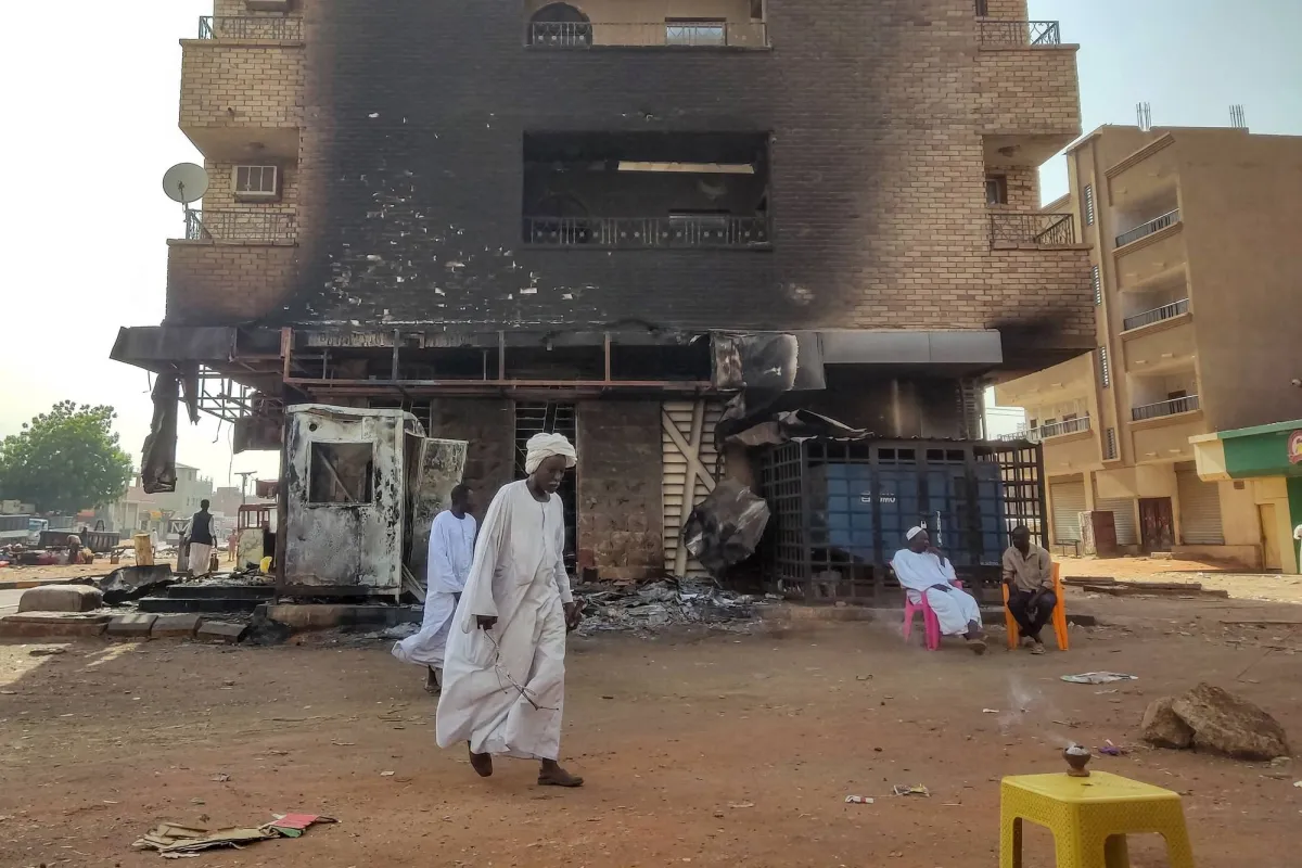 رجال يمشون خارج فرع بنك محترق في جنوب الخرطوم (أ.ف.ب)