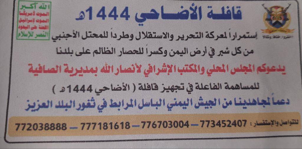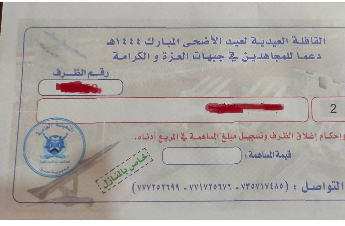 وذكرت مصادر في صنعاء أن قادة حوثيين ألزموا مسؤولي الأحياء أو من يعرفون بـ«عقال الحارات» بتوزيع مظاريف فارغة مكتوب على كل واحد منها اسم مالك السكن، ومكتوب عليها الآية القرآنية «انفروا خفافاً وثقالاً»، ومطالبتهم بدفع مبالغ مالية لإعداد قوافل تبرعات لمن تطلق عليهم الميليشيات صفة «المرابطين» في الجبهات بمناسبة عيد الأضحى.