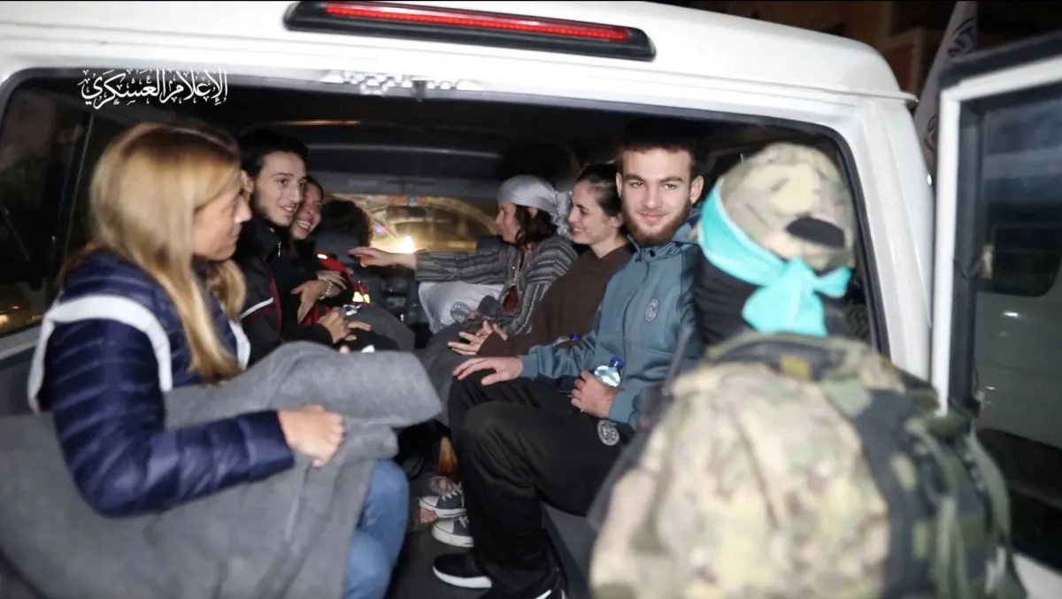 عناصر من «حماس» يقومون بتسليم بعض الرهائن الإسرائيليين إلى «الصليب الأحمر الدولي» وسط صفقة التبادل (أرشيفية- رويترز)