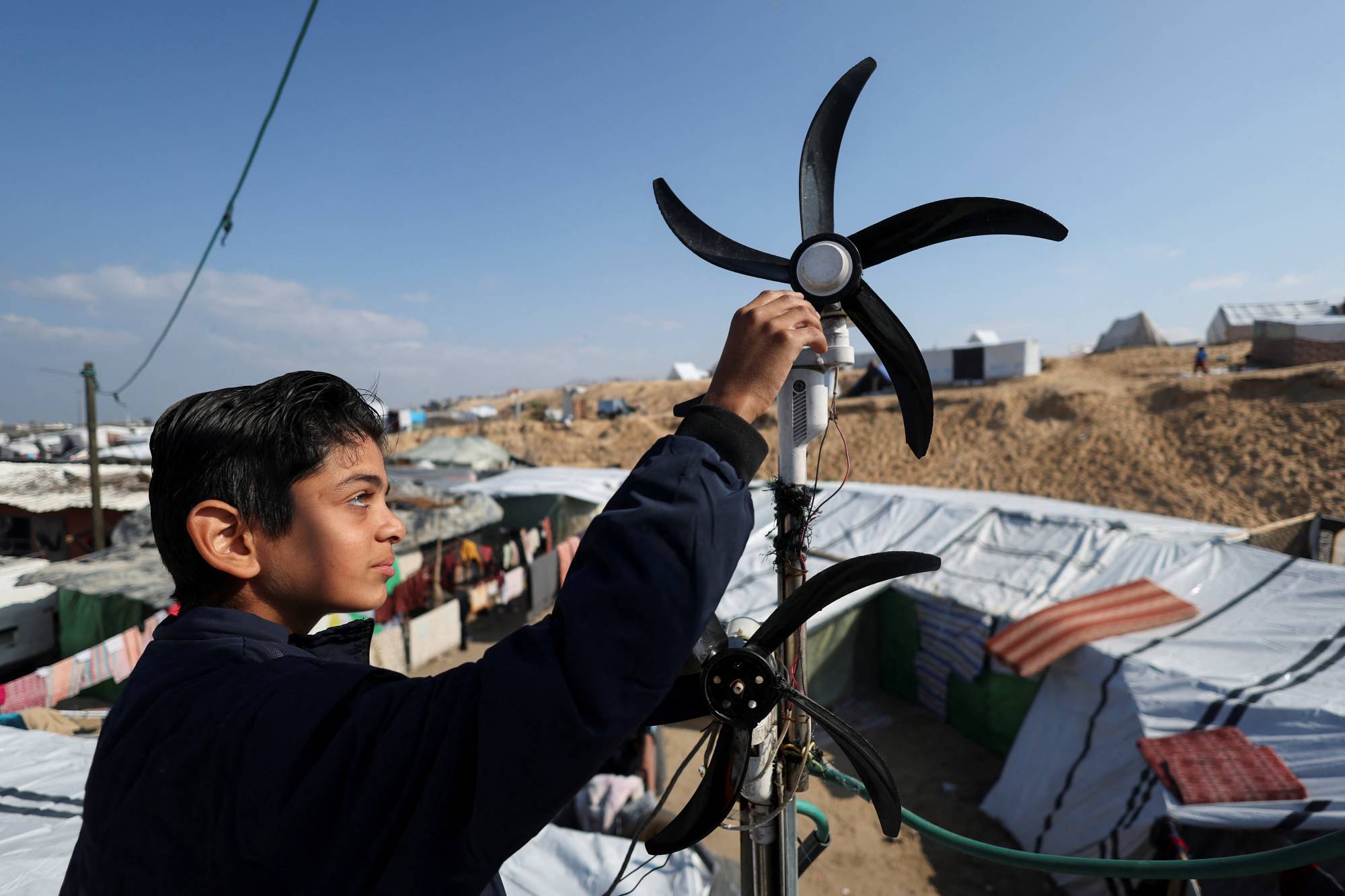 ونصبت عائلة العطار خيمتها بجانب منزل من طابق واحد، ما مكن الصبي من الصعود إلى سطح المنزل وتركيب مروحتين فوق بعضهما لتعملا كتوربيني رياح صغيرين قادرين على شحن البطاريات.