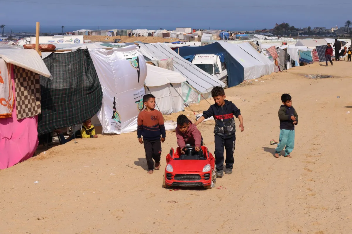 أطفال نازحون يلعبون في مدينة رفح على الحدود بين غزة ومصر (رويترز)